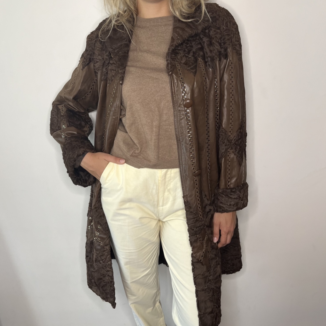 DETAILS: Vintage 70’s long leather coat in brown with fur details and gold finishes. Classic cut with very soft genuine leather texture, slightly structured shoulders, and a fit that highlights the style of the 70’s era. Features fine detailing typical of vintage craftsmanship — rich tone, smooth lining, and durable stitching. A timeless outerwear piece that pairs perfectly with both casual and dressy looks.