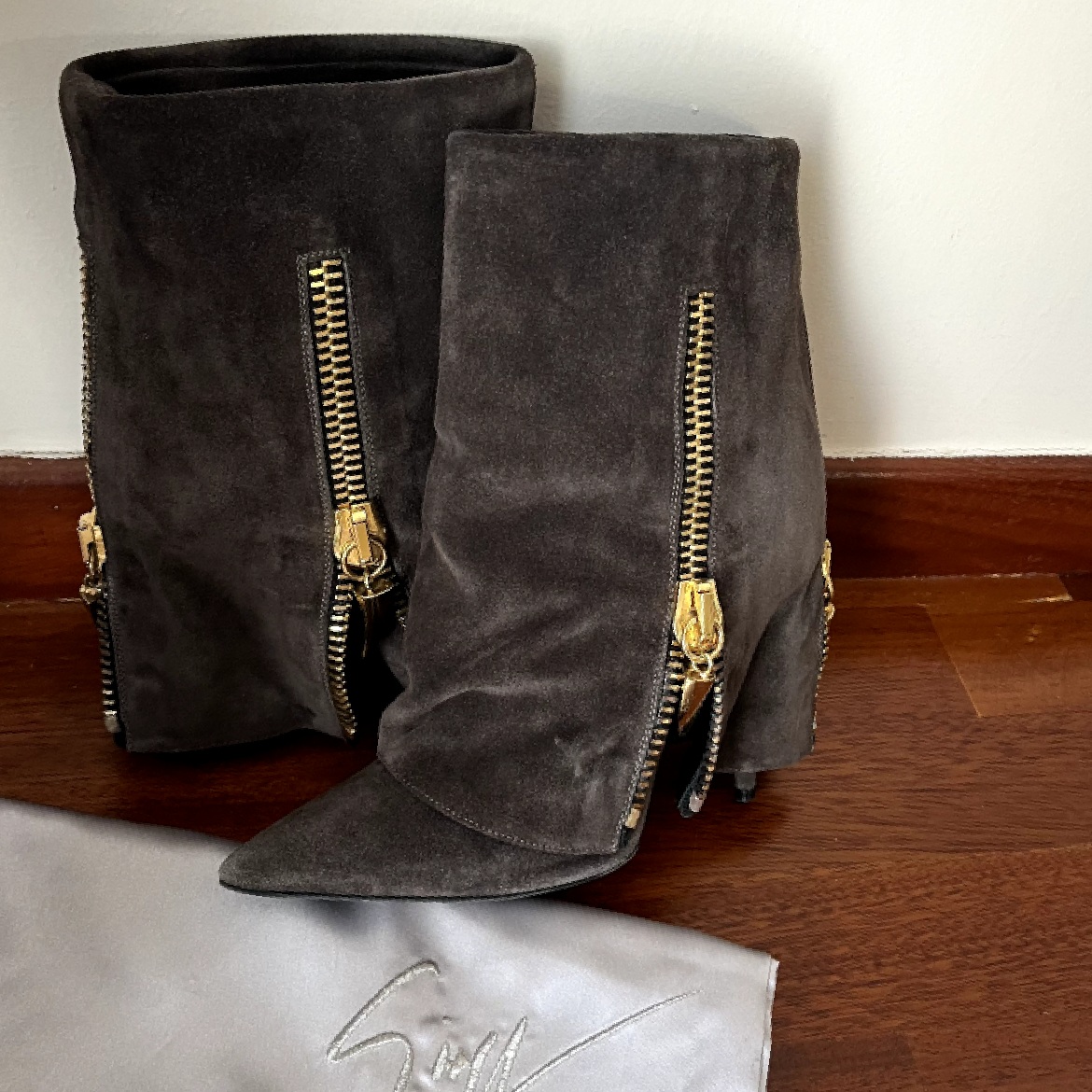 DETAILS: Suede leather, in grey color with golden zipper details. Side zipper opens up. EU38,5. Runs small. Given with their original dustbag AND box.