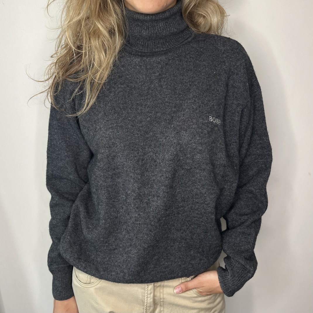 DETAILS: Hugo Boss vintage 100 % wool turtleneck sweater, Men’s Size L. In Grey. Classic roll neck style (high collar), ribbing at cuffs and hem.