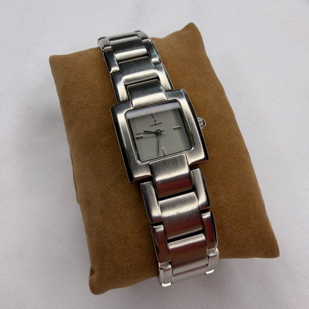 Vintage wristwatch from Le Baron, featuring a classic stainless steel case and bracelet. A reliable quartz movement powers the watch, suitable for everyday wear. Minimalist and timeless, this piece is ideal for collectors of vintage fashion watches or anyone looking for a stylish, functional timepiece. Fully functional with new battery installed. WATER RESISTANT.