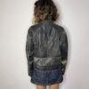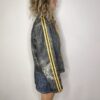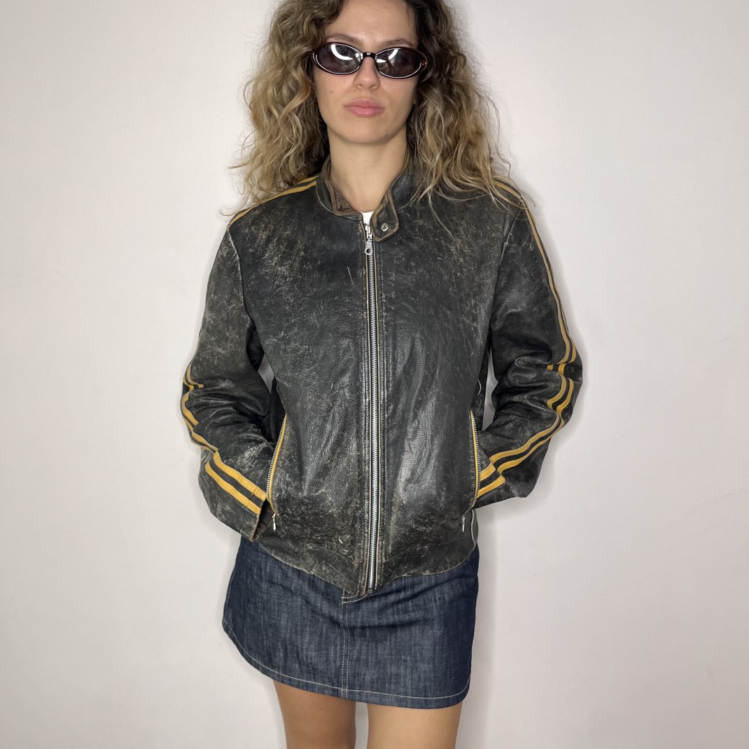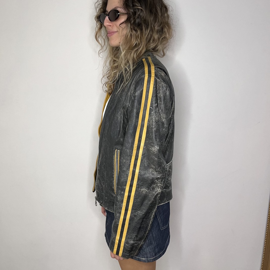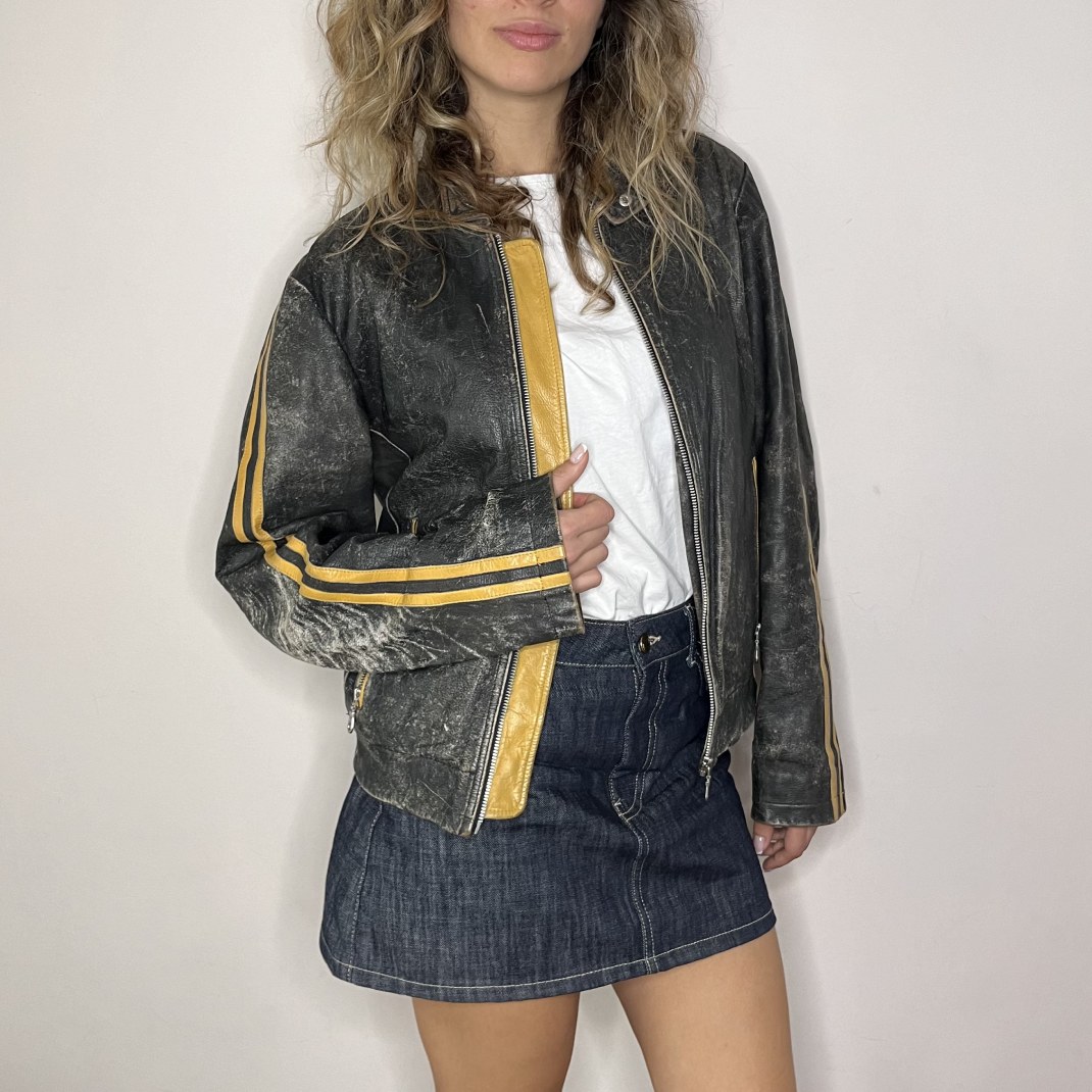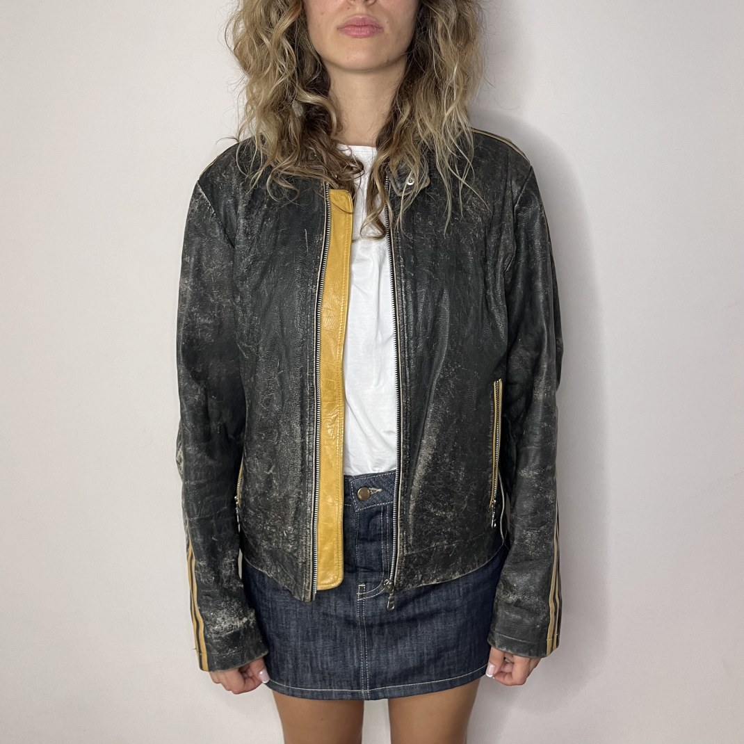 DETAILS: Genuine leather jacket in black/dark grey, biker’s style, with yellow details.