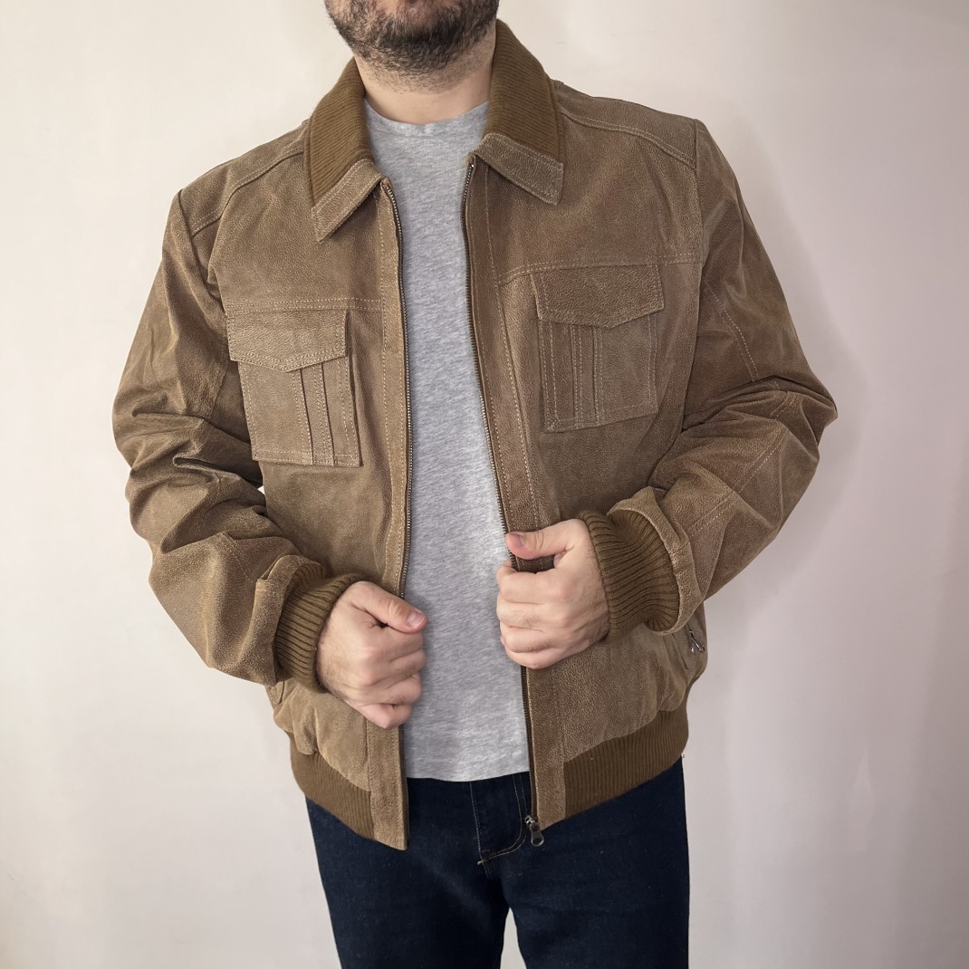 DETAILS: Genuine leather bomber jacket in light brown.