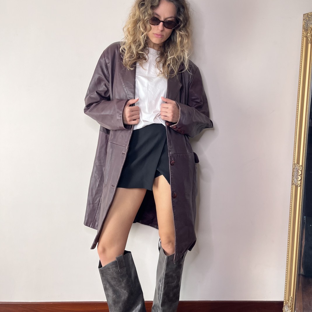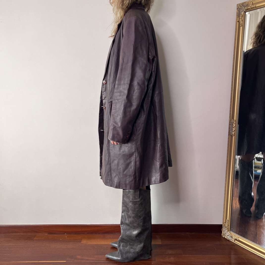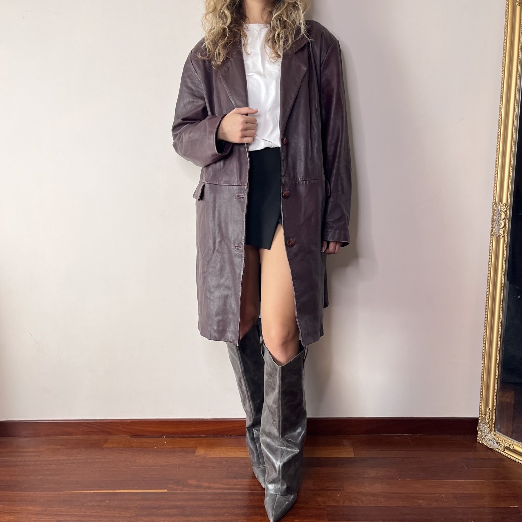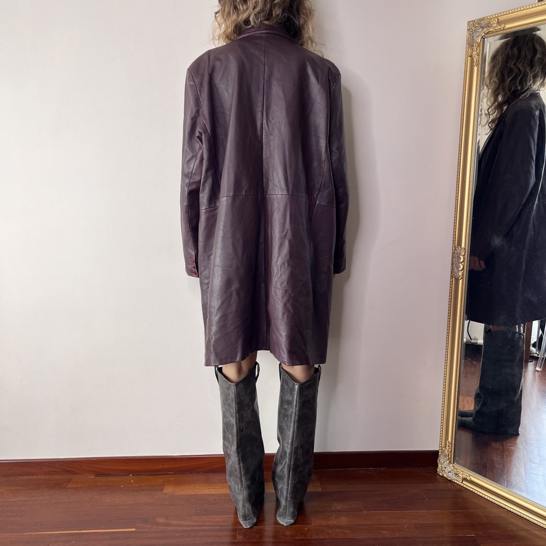 DETAILS: Genuine leather coat in deep burgundy, featuring a long elegant silhouette and smooth finish. Designed with a front button closure, side pockets, and a soft inner lining for comfort. A timeless outerwear piece that blends classic sophistication with vintage appeal.